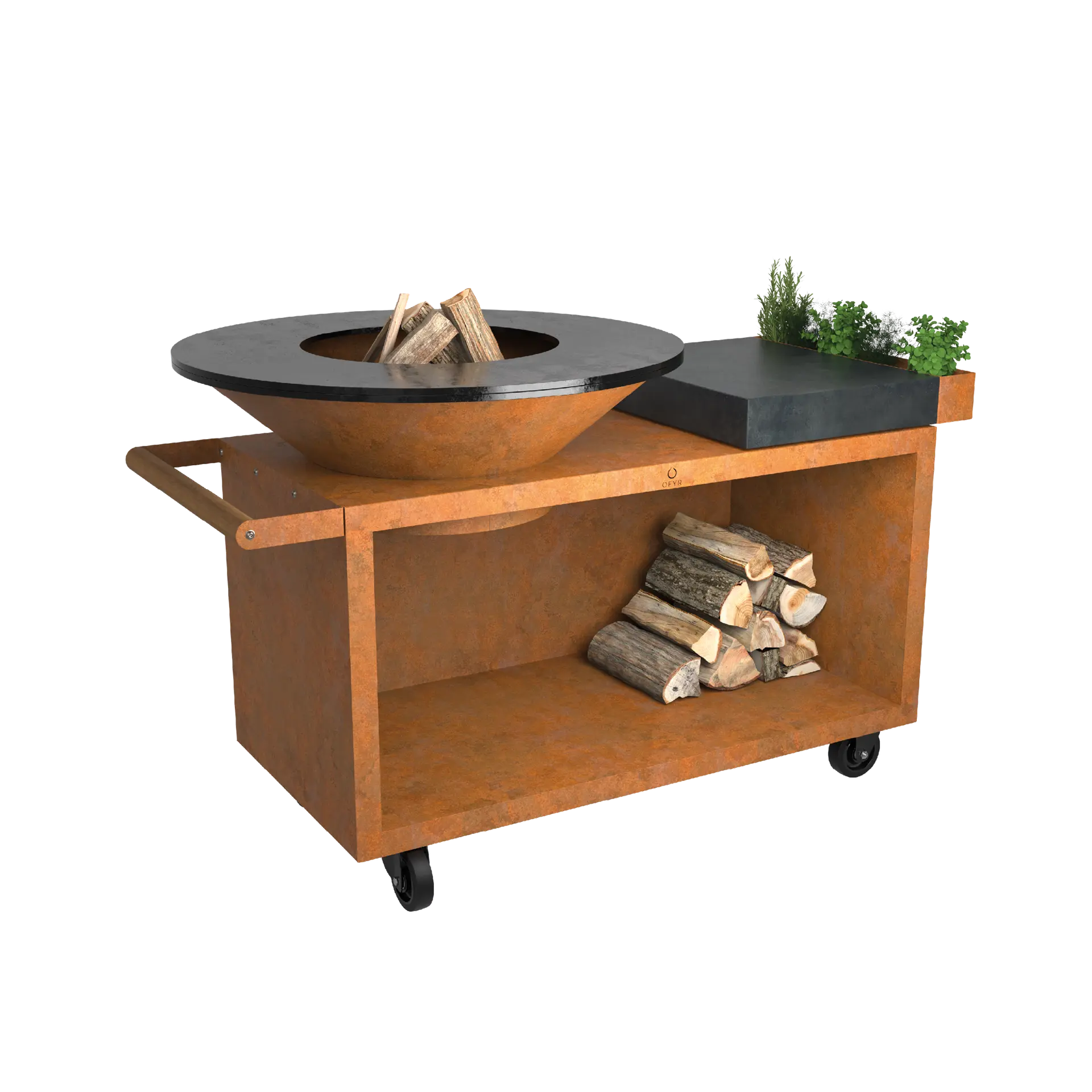 Le brasero Island+ 100 cm PRO avec planche en céramique gris foncé et rangement bois est une véritable cuisine extérieure complète. Ce modèle associe un brasero OFYR 100 cm avec plaque de cuisson en acier carbone noir, une planche de travail en céramique résistante aux intempéries, un espace de rangement pour le bois et une étagère pratique pour les ustensiles et les épices.
